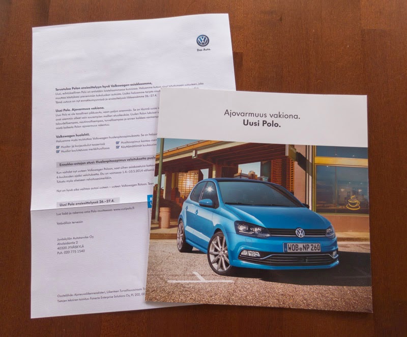 Volkswagenin kotisivujen mukaan uuden Polon ensiesittely on “keväällä” ja ajattelinkin sen olevan joskus toukokuussa. Perjantaina postiluukusta kolahti kuitenkin Volkswagen-asiakkaille suunnattu kutsu Polon ensiesittelyyn Jyväskylän Autotarvikkeelle 26-27.4. eli sehän onkin jo parin viikon päästä!