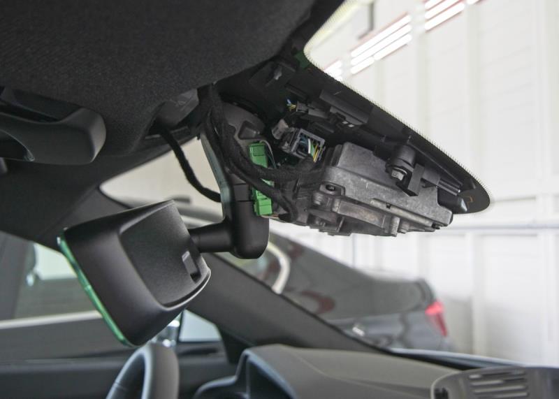 Seuraavaksi yritin irrottaa taustapeilin takana olevan sadetunnistimen yms. peittävän ison muovikotelon, mutta kotelon yläosassa oli levy, joka esti sen irrottamisen. (Levy näkyy yllä olevassa kuvassa.) Videolla kotelon yläosan levy oli irrotettu ensimmäiseksi, mutta niin nopeasti, etten tajunnut sitä kun aloitin irrottelun. Lisäksi minusta näytti siltä, että levy olisi kiinteä osa isompaa koteloa.
