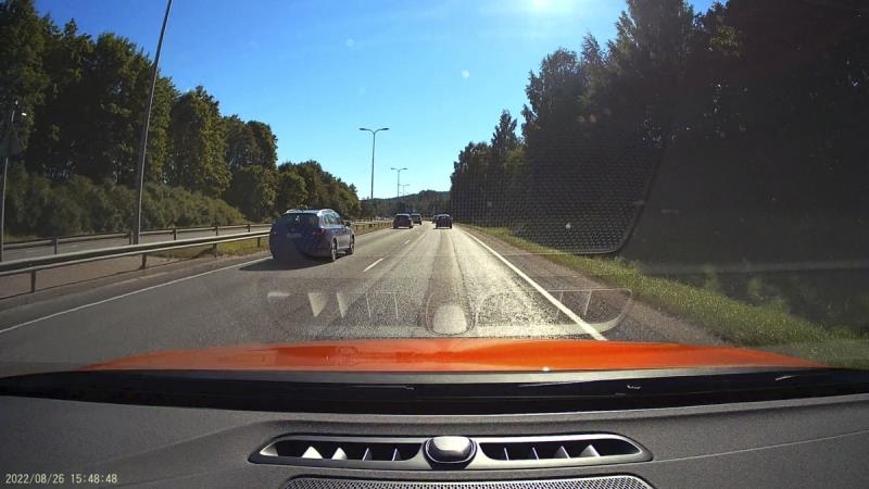 Kameran kuvassa näkyy Polestarissa aika paljon kojelautaa, vaikka linssin asentoa onkin parannettu ekasta versiosta. Mutta eipä siitä ole haittaa, koska edellä ajava liikenne näkyy kyllä kuvasta täysin. Autoja tällä kuitenkin kuvataan eikä lentokoneita.