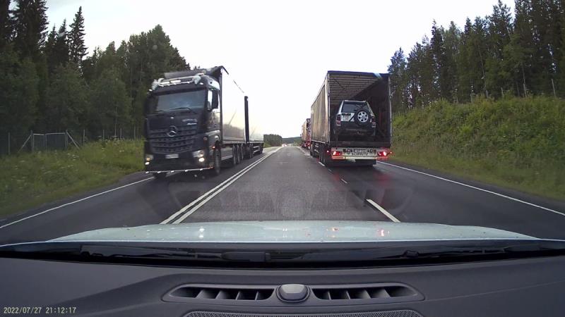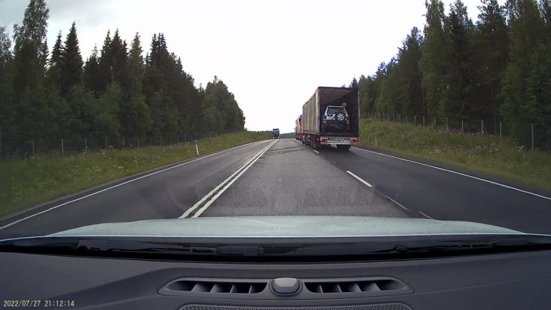 Mitään ikävää tapahtumaa kojelautakamera ei onneksi ole päässyt todistamaan. Jotain sattumia olen lukinnut ja katsellut jälkeenpäin, kuten läheltä-piti-tilanteen viime kesältä, kun siirryttyäni ohituskaistalle edelläni ajanut rekka meinasi vaihtaa kaistaa suoraan eteeni ohittaakseen edellään olleen toisen rekan.