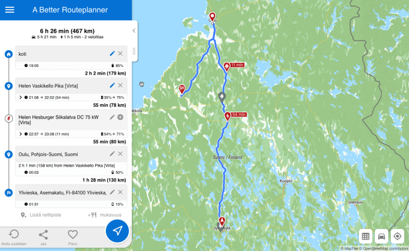 Latauskartasta siirryin nopeasti A Better Route Plannerin puolelle, koska halusin tietää, paljonko latausta oikeasti tarvitaan.