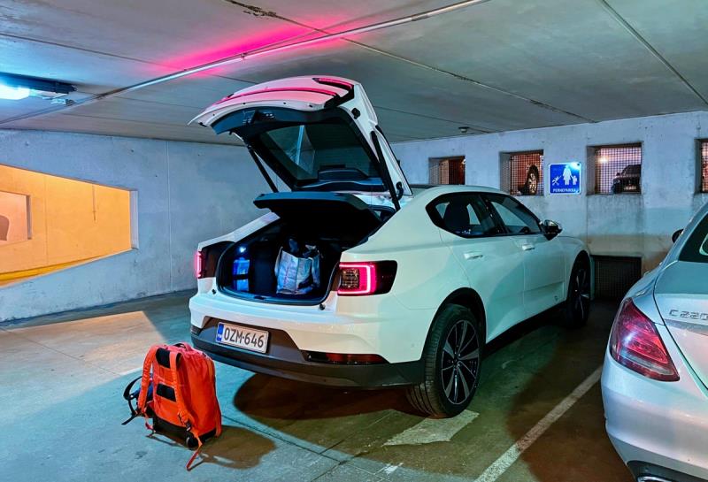 Autosaaren normaalit pysäköintiruudut olivat kapeahkoja, joten olimme hyvin ilahtuneita, kun bongasimme sieltä leveitä perheruutuja. Perheruudut on varmaankin ensisijaisesti tarkoitettu lapsiperheille, mutta perhe mekin olemme. Yksi perheenjäsenemme on muhkea Polestar 2, joka tarvitsee etäisyyttä muihin autoihin, jotta sitä ei kolhita viereisten autojen ovilla.