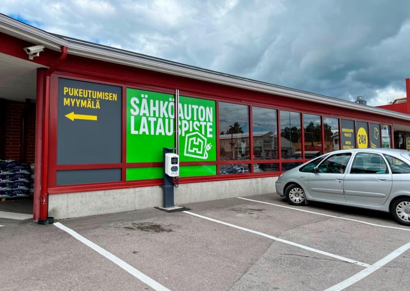 Uusi sähköauton latauspiste Ylivieskan Halpahallin pihassa. En testannut, sillä käveltiin kauppaan.
