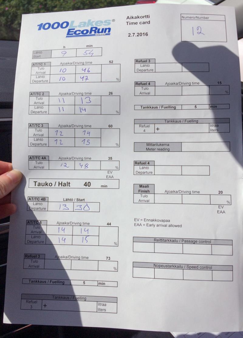 Erityisesti kisan ekoilla etapeilla tuntui siltä, etten vaan pystynyt saamaan hetkellisen kulutuksen lukemaa pieneksi, vaan mittari näytti jatkuvasti 5-6 l/100 km. Todella ärsyttävää, kun tiesi, miten pitäisi ajaa, mutta ei saanut silti kiinni oikeasta ajotyylistä! Etappien keskikulutukset eivät sentään olleet noin isoja kun rullailtiin mäkiä alas tietenkin. Ruokatauon jälkeen sain paremmin oikeasta rytmistä ja sain vakioitua kulutuksen alemmas.