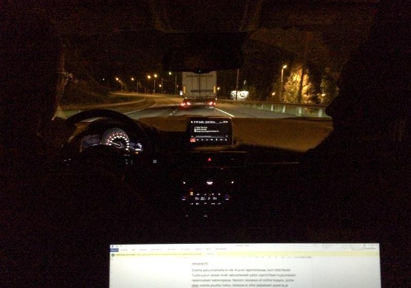 Käytiin työporukalla Helsingissä, mutta poikkeuksellisesti en ollutkaan kuski. En edes tarjoutunut, sillä paluu oli tiedossa puolen yön jälkeen. Tunnen itseni sen verran hyvin, että tiedän, etten olisi pysynyt hereillä koko matkaa. Sen sijaan istun nyt paluumatkalla työkaverin auton takapenkillä ja blogaan.