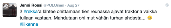 Hartolan kieppeillä ajoimme alamäkeen 80 km/h, kun näimme, että vastaan oli tulossa puoliksi pientareella ajava hidas traktori. Samalla traktoria lähti ohittamaan auto, joten työkaverini joutui jarruttamaan vauhdin johonkin 50 km/h, jotta ohittaja ehtii palata omalle kaistalleen. Mutta tilanne ei ollut vielä ohi: ohittajan perässä ylämäkeen traktoria lähti ohittamaan rekka ja sen jälkeen vielä toinenkin!