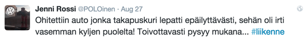 Moottoritiellä Lahden ja Helsingin välillä saavutimme auton, jonka takapuskuri lepatti jotenkin kummallisesti. Ohittaessa autoa näimme sen tarkemmin: muovinen takapuskuri oli irronnut sivulta kiinnikkeistään ja heilui 120 km/h vauhdissa melko villisti. Mahtoikohan kuski ollut huomannut sitä? Tai ehkä vain luotti siihen, että se pysyy mukana, koska sen varmaan näki sivupeilistä? Toivottavasti pysyi, sillä ei olisi kiva jos 120 km/h vauhdissa vastaan tulisi irtonainen puskuri...