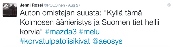 Tämä asia nyt ei ole mitään uutta, mutta kulkupelinämme ollut Mazda3 ei ole äänieristyksellä pilattu. Minusta melu on puuduttavaa ja myös auton omistava työkaverini manaili sitä, että Mazdan äänieristys ja suomalaiset tiet eivät sovi yhteen. Nelostien vasta päällystetyillä osilla olikin sitten kuin taivaassa olisi ollut, kun auto muuttui niin hiljaiseksi.
