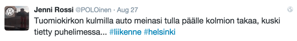 Viimeinen raportoitava tilanne tapahtui, kun olimme jo jalkautuneet ja odottelimme Etelärannan liikennevaloissa tien ylitysvuoroa. Kun autojono pysähtyi seuraavien liikennevalojen vuoksi, jonon viimeinen auto pysähtyi kohdallamme puoliksi suojatielle. Ei tässä mitään tavatonta, mutta heti pysähdyttyään auton kuski syventyi kirjoittamaan tekstaria (tms.) ja vilkuili silloin tällöin eteensä. Kun autojono sitten lähti liikkeelle, kuski oli edelleen nenä kiinni puhelimessa ja huomasi jonon lähteneen liikkeelle vasta, kun eteen oli tullut usean auton mittainen rako. Hups... Ei tässä mitään vaaratilannetta syntynyt, mutta jospa kirjoitettaisiin ne viestit periaatteesta muulloin kuin liikenteessä.