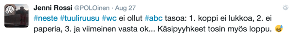 Suosin ABC-asemia pysähdyspaikkoina, koska niissä on hyvät ja siistit vessat. Tuolla Nesteellä oli kyllä siisteyden tarkastuslista eli yritystä oli, mutta kaikki oli vain päässyt loppumaan klo 19 eli 3,5 h aiemmin tehdyn tarkastuksen jälkeen. Aina ei voi voittaa.