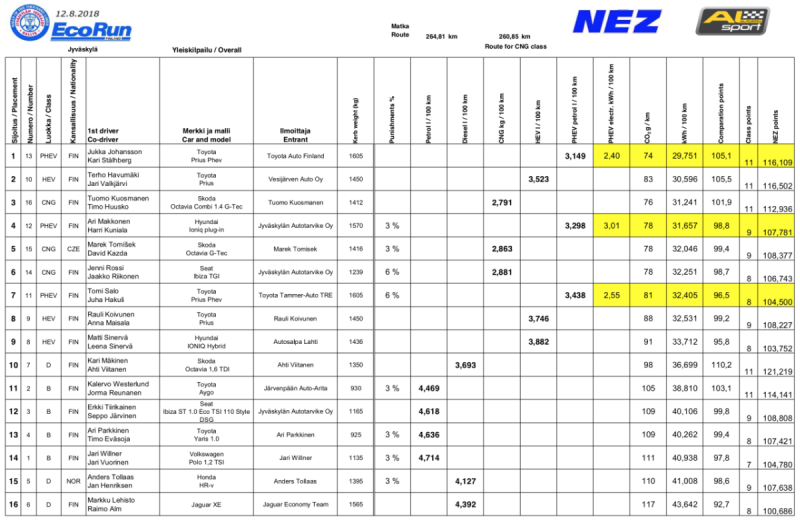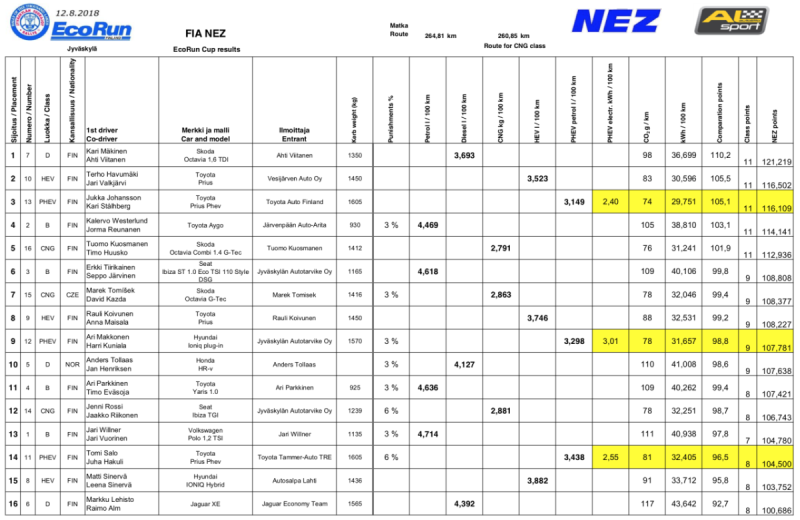 Kyllä, se on masentavaa, että hybridit voittavat käytännössä aina, ja juuri siitä syystä suomalaiseen EcoRun Cupiinkin tehtiin erilliset Modern ja Traditional sarjat. Pitäisikö NEZkin ajaa tällä erottelulla? Tosin mikäli kaasuautot ovat mukana jatkossa, ne voittavat sitten taas hyvin todennäköisesti kaikki bensa- ja dieselautot. Ehkä pitäisi vain jakaa luokkakohtaiset palkinnot eikä edes yrittää laittaa eri luokkia samalle viivalle?