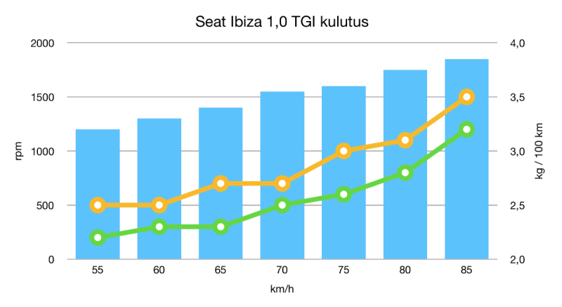 Saamieni lukemien varjossa näytti siltä, että Ibizan taloudellisin kierrosalue olisi 1300-1400 rpm, mikä tarkoitti 60-65 km/h nopeutta. Tällöin kulutus oli 2,3-2,7 kg/100 km suunnasta riippuen. Nopeuden noustessa yli 70 km/h:iin (1550 rpm >) kulutus alkoi selkeästi lisääntyä etenkin ylämäen puolella ja 80 km/h ajaessa se oli jo 2,7-3,2 kg/100 km.