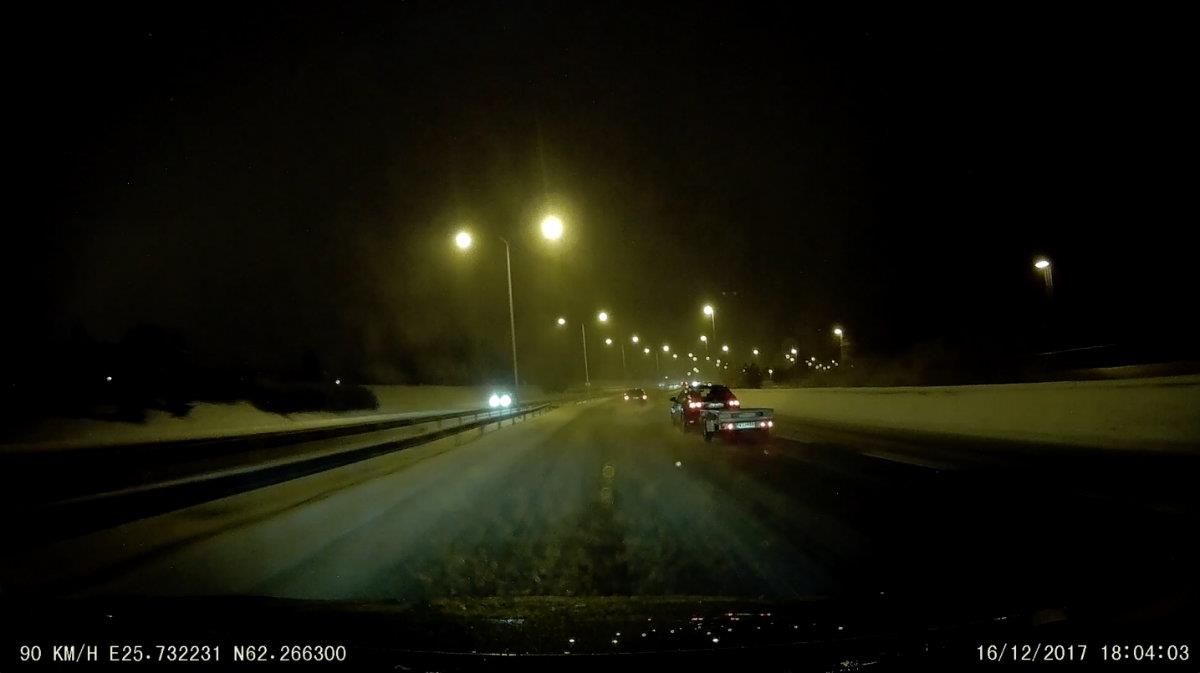 Ohituskaistalla nopeuteni oli 95 km/h pintaan, mutta loivassa kaarteessa oikealle annoin nopeuden aavistuksen tippua, sillä siinä oli vähän paksummin lunta.