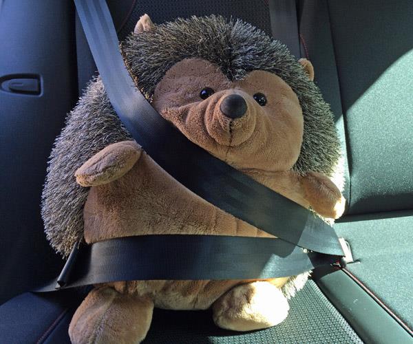 Siskoni antoi mukaani hieman tavaraa vanhempien luokse vietäväksi. Siilipallo matkusti asianmukaisesti turvavöissä, sillä olisi muuten saattanut kieriä ympäri takapenkkiä. :P