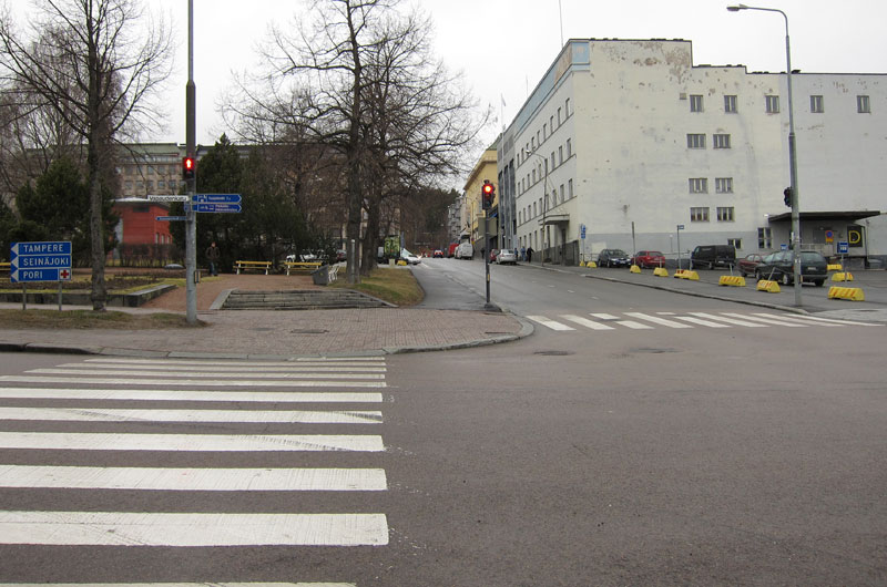 Tätä ajatusta tukee esimerkiksi alla oleva Kilpisenkadun ja Kauppakadun risteyksestä kuva. Sen mukaan Kauppakadun oikeassa reunassa on jalkakäytävä, mutta vasen reuna ja koko kirkkopuisto merkitsemätöntä aluetta. Tällä perusteella voisi nopeasti päätellä, että kirkkopuistossa saa pyöräillä. Mutta eipäs saakaan. Tieliikennelain mukaan kaikki kadusta erotetut kohdat ovat jalkakäytäviä. Liikennemerkin käyttämisestä jalkakäytävien yhteydessä ei sanota mitään, vaan vain pyörätie (ja kevyenliikenteenväylä, koska se on tarkoitettu myös pyöräilijöille) täytyy erikseen merkitä liikennemerkillä.