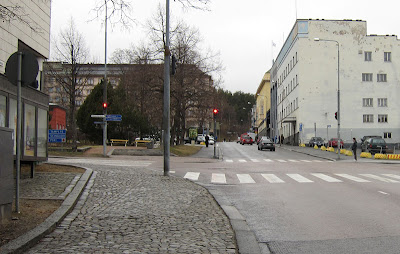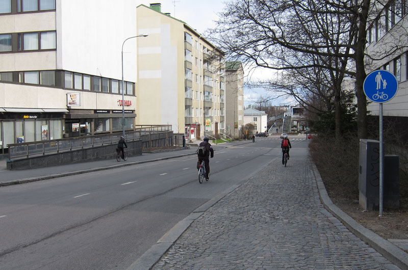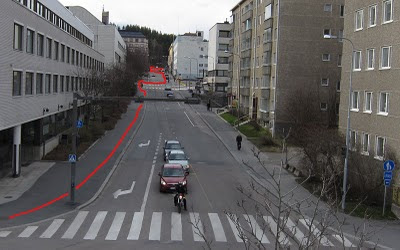 Edit 13.5.2011: Kadun saa ajaa ylös saakka sen oikeaa reunaa pitkin, koska yksi kortteli lasketaan kaupunkialueella lyhyeksi matkaksi. Katso uudempi merkintä aiheesta.