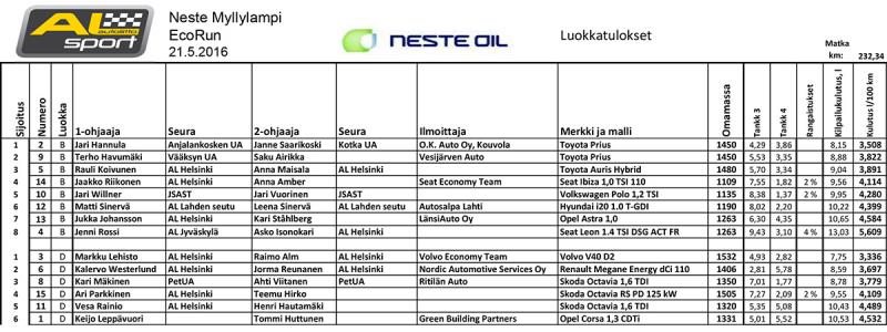 Myllylammen ecoruniin osallistui 15 autoa, joista yhdeksän kulki bensalla. Näistä neljä oli hybridejä, joista kolme vielä samanlaisia uusia Toyota Priuksia. Olin ihan varma, että hybridit vievät ensimmäiset sijat etenkin, kun kisan keskinopeuspyynnit olivat niin maltillisia; pääosin 55-64 km/h. Alussa ja lopussa pyynti oli 74 km/h, kun ajettiin niin pitkän motaria. Todettiin muutamien kisaajien kanssa jo ennen reitille lähtöä, että hybridit kisaavat kärkisijoista ja me perinteisillä autoilla niistä seuraavista ja niinhän siinä kävi. Yksi Prius tosin keskeytti ajettuaan harhaan pahemman kerran.
