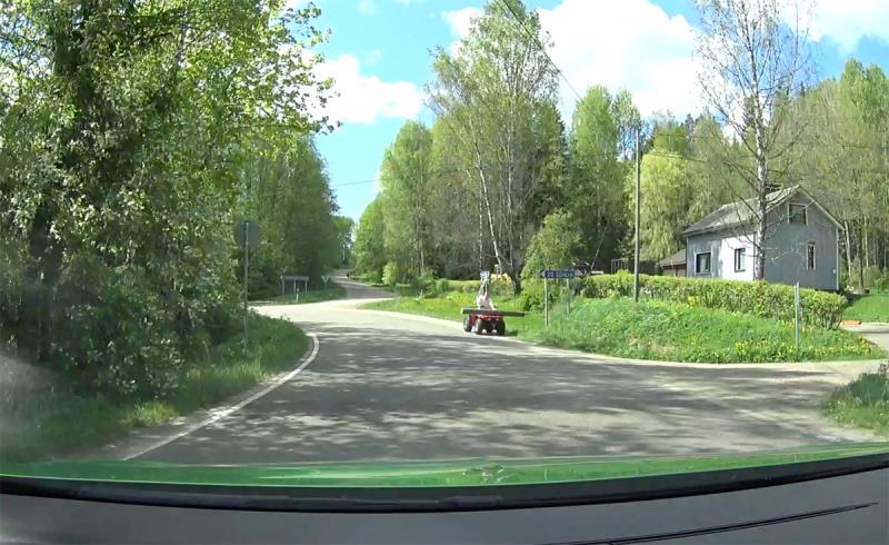 Vaikka oli kevätkisa, leikkuupuimurit onneksi loistivat poissaolollaan. Noh, olihan siinä yhdessä traktorissa jo riittävästi haittaa. Yhdessä vasemmalle kaartavassa mutkassa kohdattiin sen sijaan leveä kuljetus ja vielä meidän kaistalla! Joku kaistapää ajoi siinä vastaan mönkijällä, jossa oli kyydissä vaakasuorassa puolitoistametrinen tukki. Onneksi ei ollut vastaantulijoita, niin pystyttiin väistämään se.