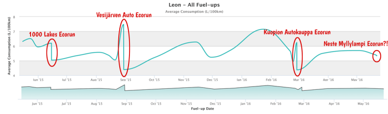 Normaalisti Ecorunin alkutankkauksen pitäisi tehdä auton polttoaineen kulutuksen seurantakaavioon piikki (koska ammattilaisten suorittama kisatankkaus on niin tappiin saakka tehty). Tässä kisassa alkutankauksesta laskettu kulutus oli kuitenkin täsmälleen sama kuin auton näyttämä 5,3 l/100 km. Ja tämän kisaa edeltäneen matkan keskinopeus oli 81 km/h, kun kisassa keskinopeus oli vain 59 km/h. Ei oikein kuulosta loogiselta, että kisareitin 22 km/h hitaammalla nopeudella kulutus olisi desin enemmän?