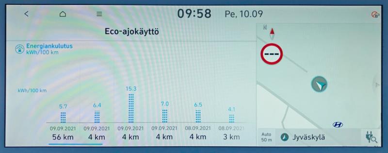 Liikennemerkkien lisäksi IONIQ 5 lukee nopeusrajoituksia osittain myös karttadatasta, mikä aiheuttaa välillä vääriä “hälytyksiä”.