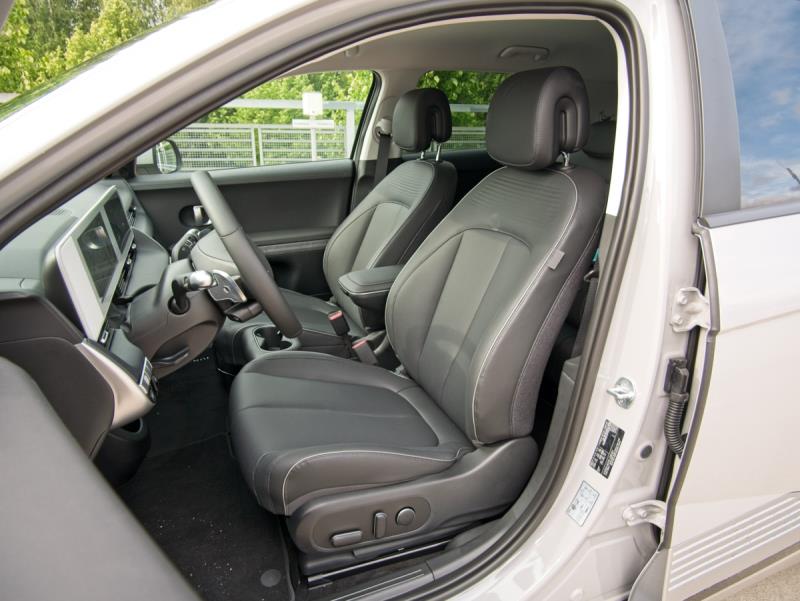 Yksi IONIQ 5:n hypetetty ominaisuus on, että etuistuimet voi kallistaa lepoasentoon saakka. Ajatuksena on, että samalla kun autoa lataa, voi ottaa torkut. Premium-varustetasossa istuimissa on lisäksi jalkatuki, mutta kyllä Stylenkin penkkiin kelpaa kellahtaa. Lataaminen on tosin niin nopeaa, ettei kovin pitkiä päikkäreitä ehdi ottaa.