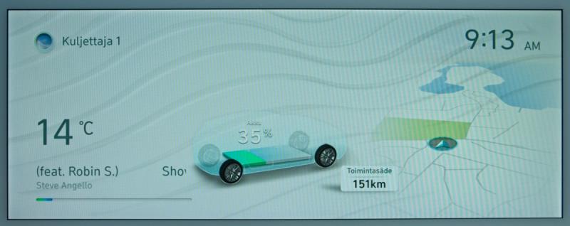 Infotainmentin päänäkymä on tyylikkään pelkistetty. Se kertoo toimintamatkan, soivan biisin ja himmeänä taustalla nykyisen sijainnin kartalla. Eri kuljettajille voi luoda autoon omat profiilit, mikä on mukavaa, koska asetuksia on valtavasti.