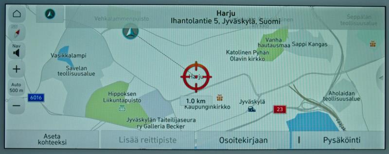 Navigaattorin karttanäkymästä en oikein pitänyt. Jos karttaa vierittää yhtään sivuun siitä pisteestä jossa on, kartalle ilmaantuu heti häränsilmä osoittamaan keskikohdan etäisyyttä nykyisestä sijainnista. Lisäksi navigaattori näyttää ihan liian vähän teitä, jos zoomaa vähänkin kauemmas. Navigaattorin ohjaamana ajaessa tämä ei haittaa, mutta jos haluaa etsiä kartalta kohteen, on se näppärämpi tehdä puhelimen näytöltä.