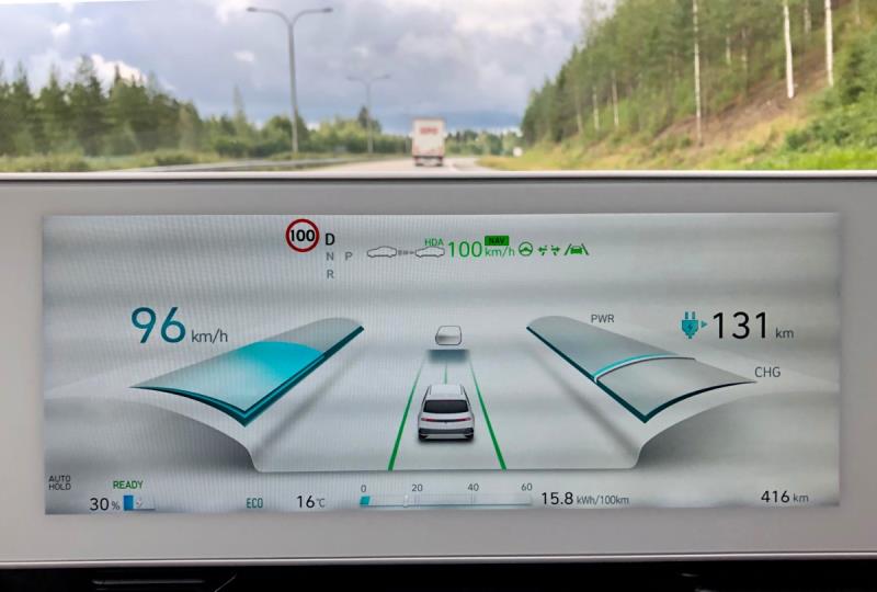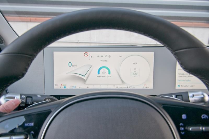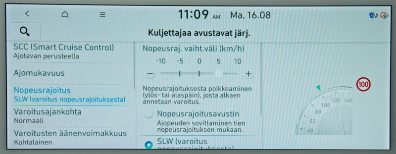 IONIQ 5 tunnistaa tien varsilta nopeusrajoitukset ja varoittaa, jos ajaa ylinopeutta. Jos ei halua varoitusta pienestä ylinopeudesta, voi auton asetuksissa voi nostaa ilmoitusrajaa ylemmäs, esim. 5 km/h yli rajoituksen, jolloin tulee katettua mahdollinen mittarivirhe.