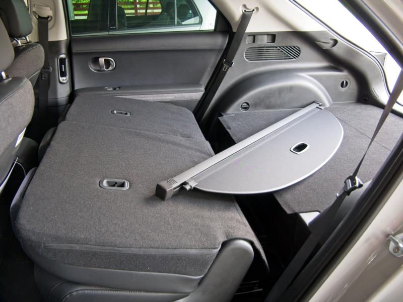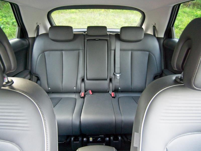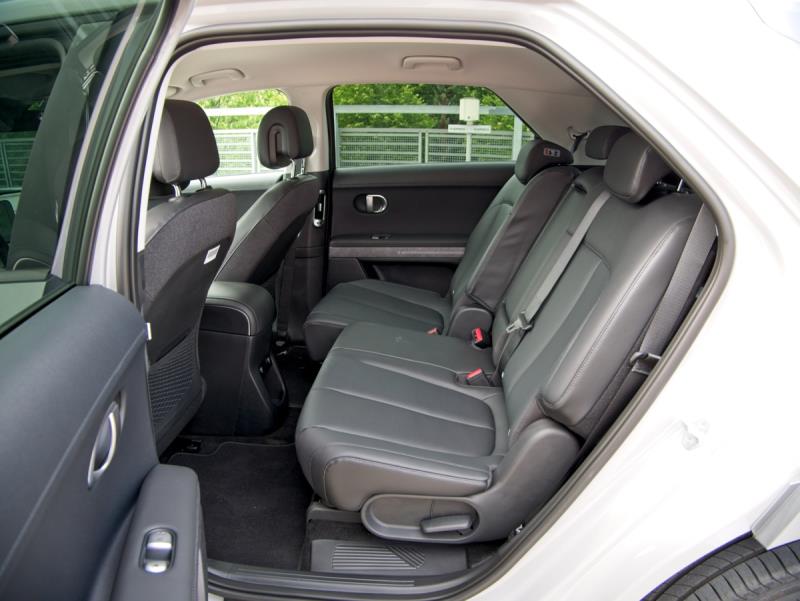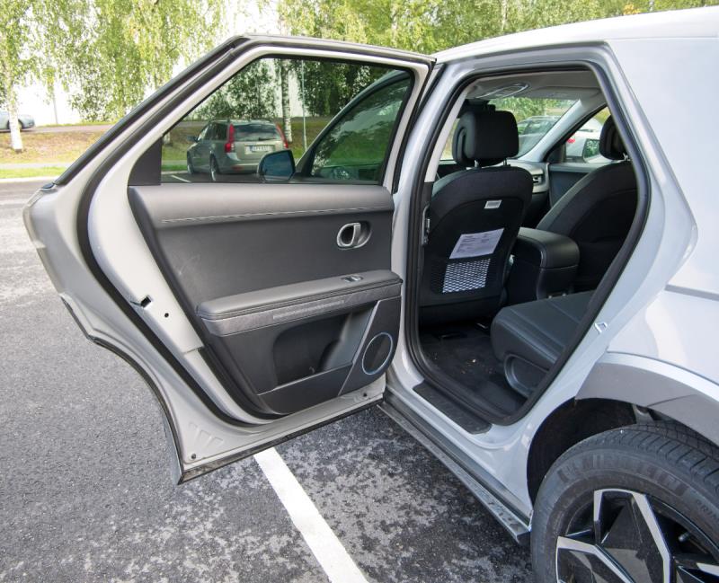 IONIQ 5:n takapenkillä kelpaisi aikuisenkin matkustaa pidempi siivu. Takapenkkien kaltevuutta ja etäisyyttä voi säätää - Premium-varustetasossa sähköisesti -, joten niissä saa varsin mukavan asennon. Myös istuimen kulma on mukava. Tilaa jaloille on kolmen metrin akselivälin ansiosta ihan hillittömästi! 193 cm pitkä naapuri kokeili ensin etupenkkiä ja meni sitten istumaan taakse, eivätkä hänen polvensa edes osuneet etuistuimen selkänojaan.