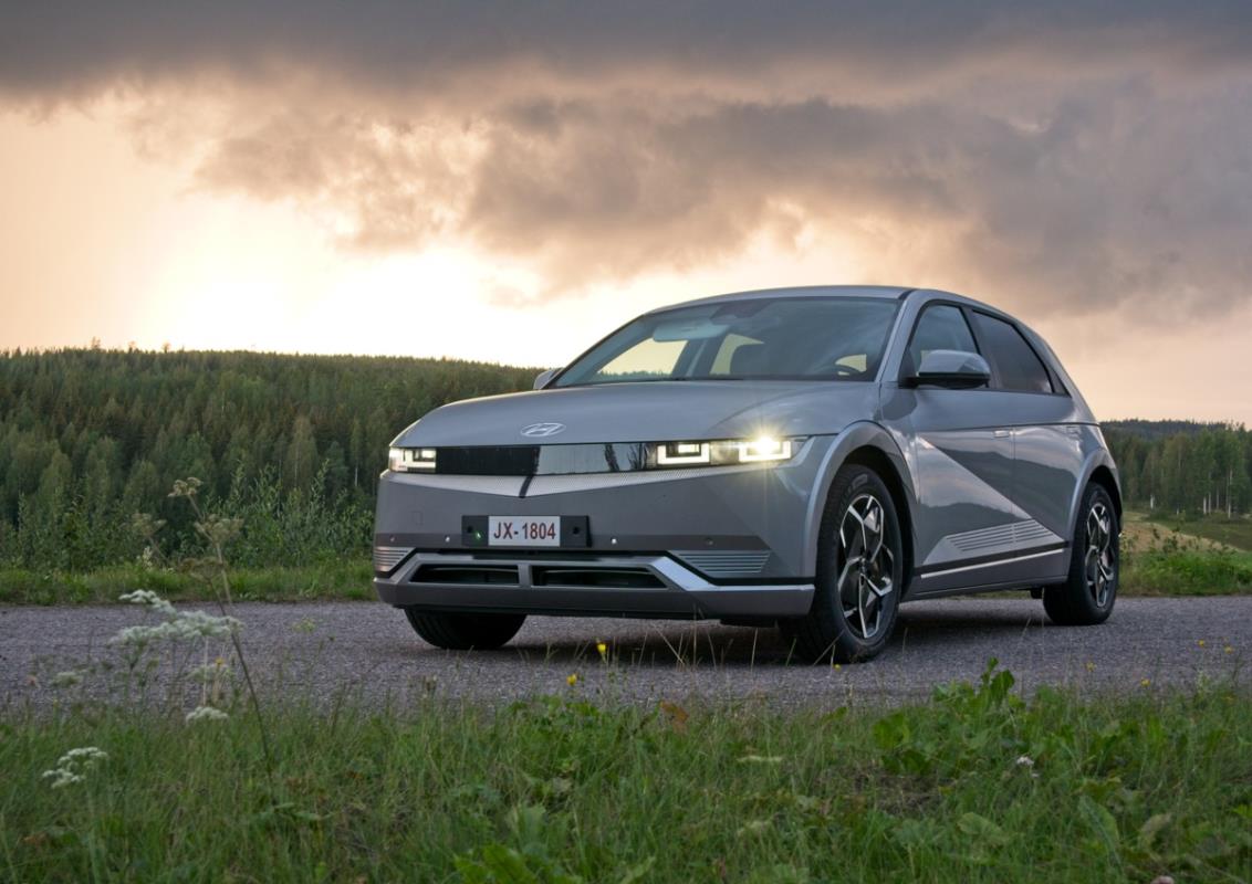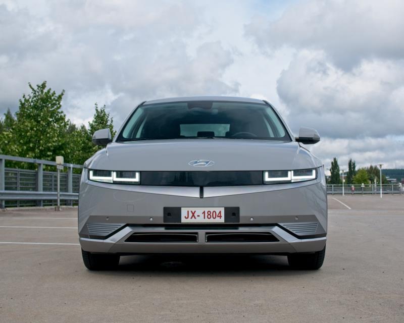 IONIQ 5 edestä. Helman ilmanottoaukot ovat kuvaushetkellä auki.
