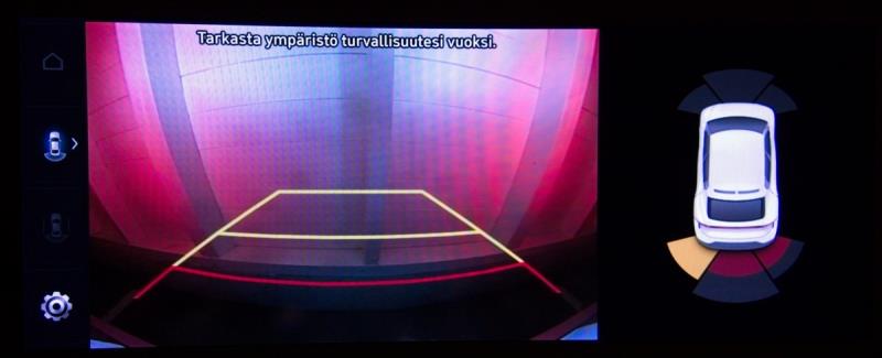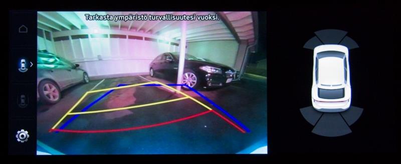 Premium-varustetasossa on 360° kamera joka näyttää videoiden perusteella tosi siistiltä! Se näyttää reaaliaikaisen 3D-kuvan autosta, ja autoa voi pyöritellä näytöllä mielin määrin. Toki kuvan saa myös suoraan ylhäältä, mitä voi hyödyntää esimerkiksi kadun varteen pysäköidessä. Kuvassa näkyy myös ratin mukaan kääntyvät ohjausviivat, jotka näyttävät mihin renkaat kulkevat.
