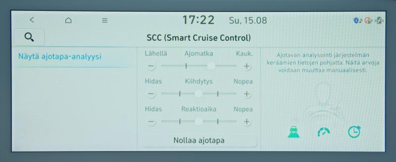 IONIQin vakkarin voi määritellä kiihdyttymään ajotilan sijasta kuljettajan oman ajotavan mukaan. Analyysiä kuljettajan ajotavasta pääsee myös tarkastelemaan ja se sisältää etäisyyden, kiihdytyksen ja reagointinopeuden.