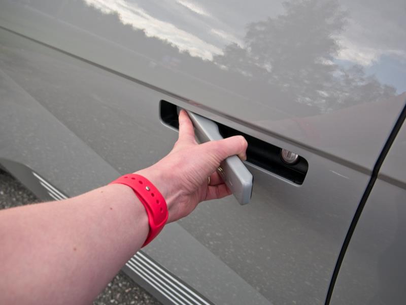 Ovien lukitus ei aukea automaattisesti avainten kanssa autoa lähestyessä. Lukitus avataan sen sijaan painamalla napakasti kahvan takareunaa niin, että siitä kuuluu pieni napsahdus. Luulin aluksi, että lukitus ei toimi, kun vain hipaisin kahvan ruutukuviota (mihin olen joissain autoissa tottunut), mutta en siis vain osannut käyttää sitä.