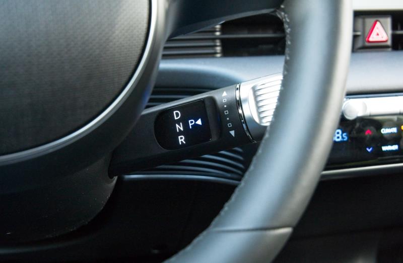 IONIQ 5 käynnistetään ratin oikealla puolella olevasta painikkeesta. Vaihteita vaihdetaan ratista oikealle alaviistoon osoittavasta viiksestä; kiertämällä ylös D (eteen), keskellä N (vapaa) ja kiertämällä alas R (peruutus). Parkkivaihde P on viiksen päässä.