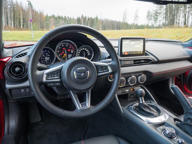 Mazdan mukaan MX-5:n filosofiana on, että auto olisi yhtä kuljettajansa kanssa ja että sillä olisi hauska ajaa. Allekirjoitan tämän täysin, sillä fiilis MX-5 ratin takana oli mahtava! Kun koeajon jälkeen pääsin töihin, oli naamani koko aamupäivän kuin Hangon keksillä. Pitäisiköhän vaihtaa moottoripyörä käytettyyn Miataan...? :P