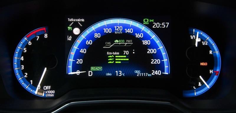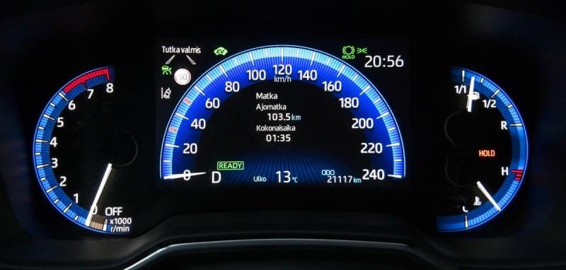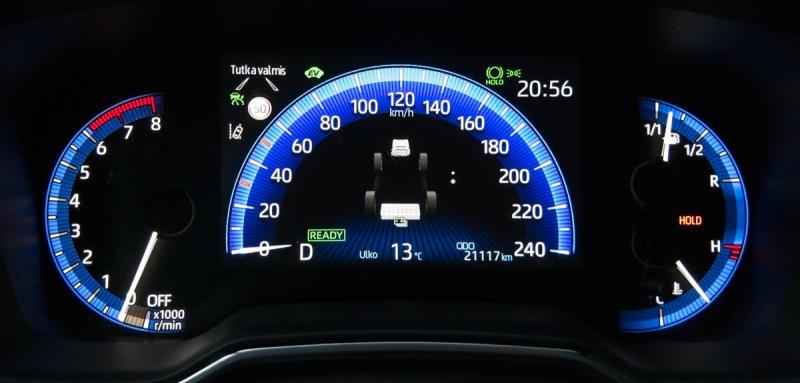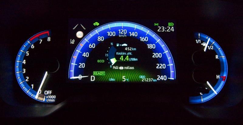 Corollassa on varustetasosta riippuen joko pieni tai iso näyttö ratin keskellä, joissain malleissa hud-näyttö ja lisäksi iso kosketusnäyttö keskellä kojelautaa. Koeajamassani Hybrid Active Edition versiossa oli iso näyttö ratin takana, mutta hud puuttui.