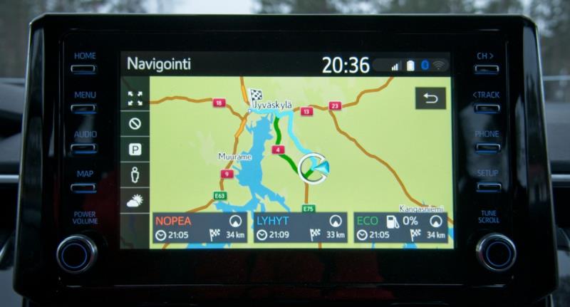 Jos navigaattorille antaa määränpään käsin kirjoittamalla, auto tarjoaa kolmea eri reittivaihtoehtoa. Valinnassa pitää kuitenkin olla ripeä, sillä se ei näy ruudulla kuin muutaman sekunnin ennen kuin auto alkaa opastaa oletusreittiä. Reitin asetuksista voi kuitenkin valita kesken ajon eri reittiprofiilin.