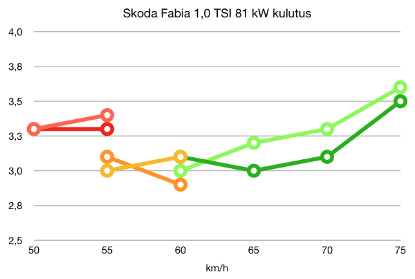 Testi osoitti, että 81 kW Fabialla olisi taloudellisinta ajaa 55-65 km/h nopeudella 1250-1400 rpm kierroksilla 5. ja 6. vaihteita käyttäen. Vaihdetta 4 kannattaisi välttää, koska sillä kulutus (ja kierrokset) nousivat selkeästi korkeammiksi.