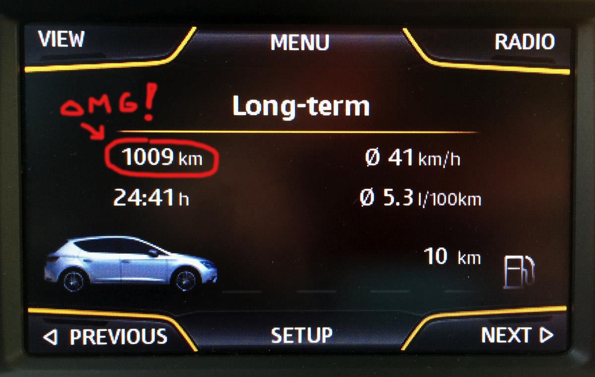 Meidän Seat Leon 1.4 TSI DSG ACT FR:n kulutus on todistetusti todella pieni: sain ajettua sillä yhdellä tankillisella peräti 1012 kilometriä! Olen tästä todella innoissani! Olen pitänyt tonnin ylittämistä bensakäyttöisellä autolla melko mahdottomana tehtävänä, mutta niin se vain tuli täyteen!