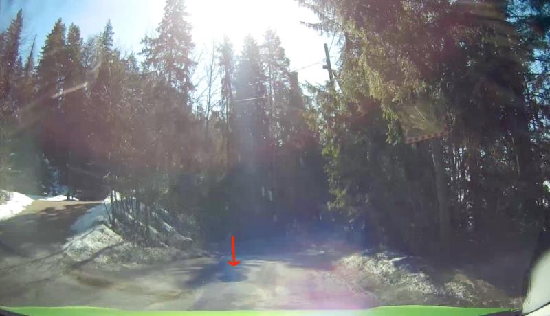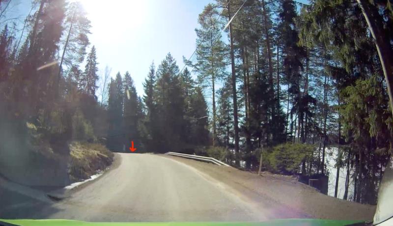 Ajoin suoraan kuoppaan, koska en erottanut sitä ollenkaan tiestä. Kirkas auringonpaiste, reikäiset tiet ja puiden varjot eivät ole hyvä yhdistelmä! Kojelautakamera tulkitsi jysäyksen vaaratilanteeksi ja lukitsi videon. Onneksi jysäys ei se sentään ollut niin paha kuin viime talvena kotini läheisellä tietyöalueella, missä kuoppaan ajamisen jälkeen jouduin käyttämään auton pyöränkulmien tarkastuksessa…