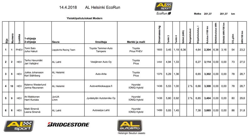 Myös dieseleitä oli kisassa vain kaksi. Modern Cup vetää kilpailijoita enemmän puoleensa, sillä itse lataavia hybridejä oli kisassa viisi ja latayshybridejä yksi. Tomi Salo voitti yleiskilpailun suvereenisti Toyota Prius PHEV -lataushybridillä, vaikka auton kulutuksessa huomioidaan ladattu energia.