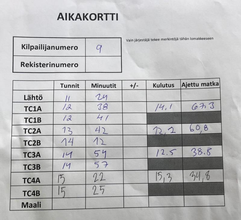 Saapuessamme maaliin kaikki muut kilpailijat olivat jo lähteneet ja paikalla oli enää järjestäjiä. Vaikka olimme kiertäneet ylimääräisen lenkin, annoimme kuitenkin aikakorttiin koko kilpailun kulutuksen. Se oli sama 13,4 kWh/100 km kuin viimeiselle AT:lle tullessakin.