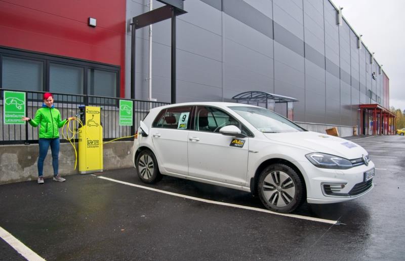 Latasimme ensin 5 km päässä olevalla hitaalla type 2 -latauspisteellä vartin ja jatkoin sitten 4 km päähän pikalaturille Hämeenkylän K-Supermarketllle. Olisi sinne varmaankin päässyt suoraan viimeiseltä AT:lta oikein pihistelemällä, mutten uskaltanut kokeilla, ettei auto jätä tielle. Yllätykseni laturilla oli jo toinen kilpailun e-Golfeista. Ja kun olimme itse lähdössä sieltä, tuli sinne vielä kilpailun kolmas e-Golf. Se on hirveän hyvä auto ajaa, mutta akku on vähän liian pieni!