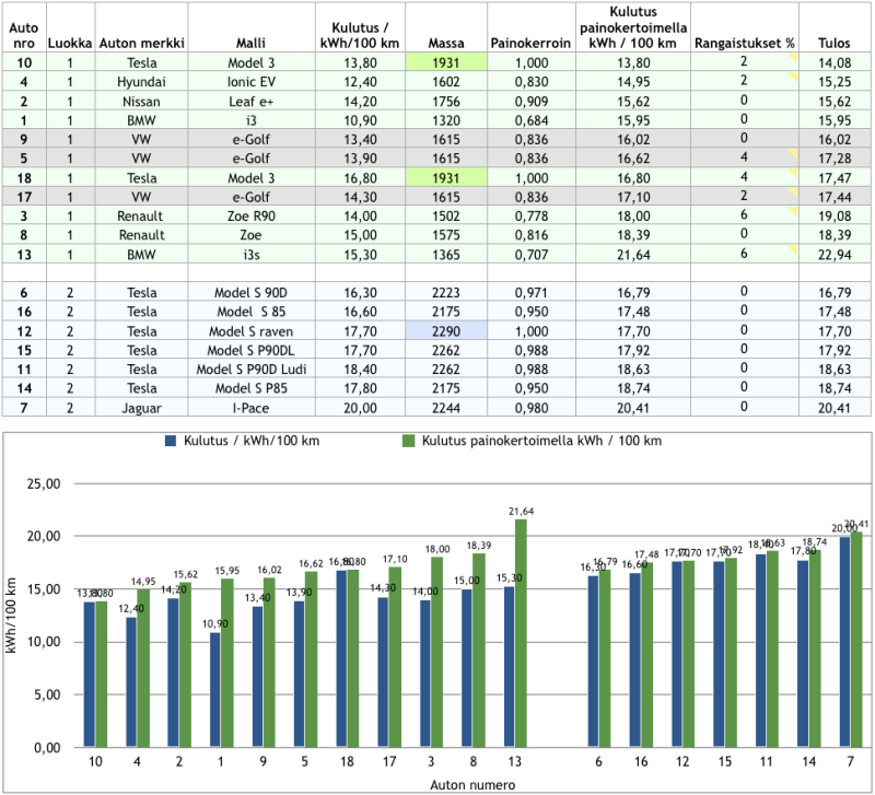 Ajoin e-Golfilla maaliin laturin kautta, joten minut hylättiin. Laskin kuitenkin mielenkiinnosta kilpailun lopputuloksen myös itselleni. E-Golfin painokerroin oli 0,836 (1615 kg / 1931 kg), joten absoluuttinen kulutus 13,4 kWh/100 km muuttuu lopputuloksissa lukemaan 16,03 kWh/100 km. Sillä olisi sijoittunut kevyiden autojen luokan viidenneksi