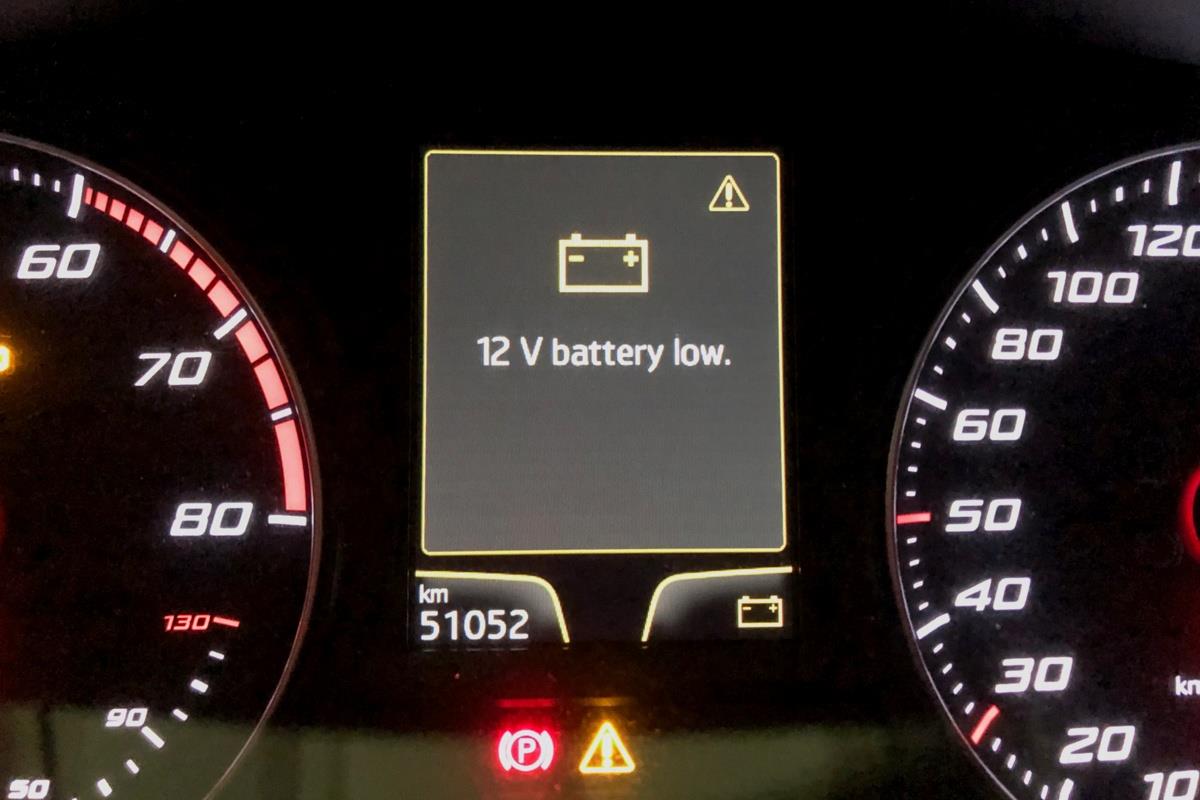 Auto varoitti akun niukasta varauksesta: "Warning: battery low. Please start the engine or switch off the infotainment system."