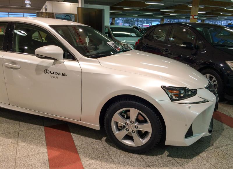 Lexus IS 300h oli ahdettu liikkeessä niin lähelle seinää ja vaihtoautoja, että en saanut sitä mahtumaan edes kokonaan kuvaan!