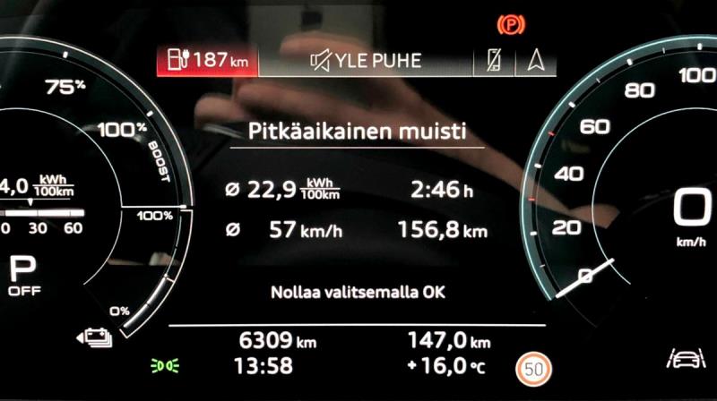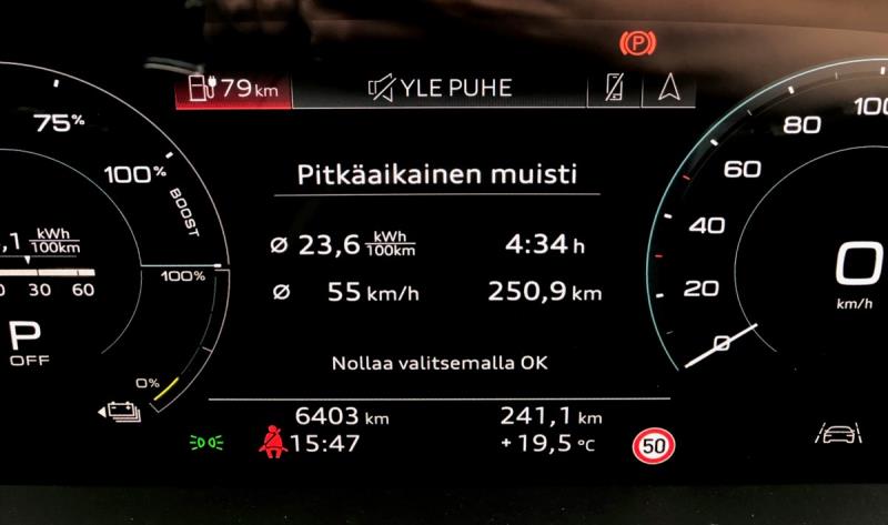 Kilpailussa ajamani kulutuslukema 23,6 kWh/100 km oli kohtuullinen olosuhteet ja auton koko huomioon ottaen. Auton toimintamatka olisi kisapäivän kulutuksella noin 340 km (10 km kisapaikalle + 251 km kilpailumatka + 79 km jäljelle jäänyt toimintamatka.) Audin WLTP:n mukainen toimintamatka on 417 km, joten siitä jäätiin vielä aika kauas.