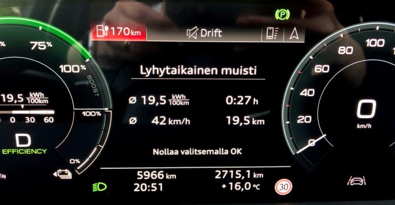 Ennen kilpailua kävin ajamassa e-tronilla 20 km pituisen kaupunkia ja maantietä sisältävän vakiokulutuslenkkini, jolla sähköä kului 19,5 kWh/100 km. Lupaavaa!