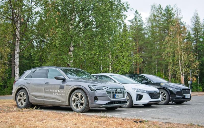 Kilpailun sähköautot yhteiskuvassa: Audi e-tron, Hyundai Ioniq electric ja Jaguar I-Pace. BMW i3 puuttuu kuvasta, koska lähti jo kotiin (tai lataamaan).