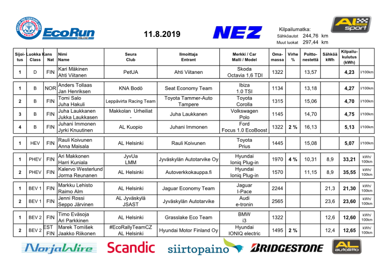 Pienten sähköautojen absoluuttisesti pienimmän kulutuksen 12,4 kWh/100 km ajoi Hyundai ioniq electricillä Tsekkiläinen kaverini Marek, mutta hän putosi lopputuloksissa toiseksi, koska sai myöhästymisestä sakkoa 2% ja lopullinen kulutus oli siten 12,65 kWh/100 km. Tuloksissa voittaja oli BMW i3, joka ajoi kulutuksen 12,6 kWh/100 km.